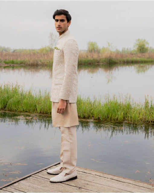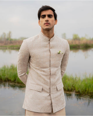 - LIGHT BEIGE, RAW SILK BUNDI REPLETE WITH ARCHITECTURAL MOTIFS IN CHROME APPLIQUE, AND TEAMED WITH A BEIGE SILK KURTA AND TROUSERS
