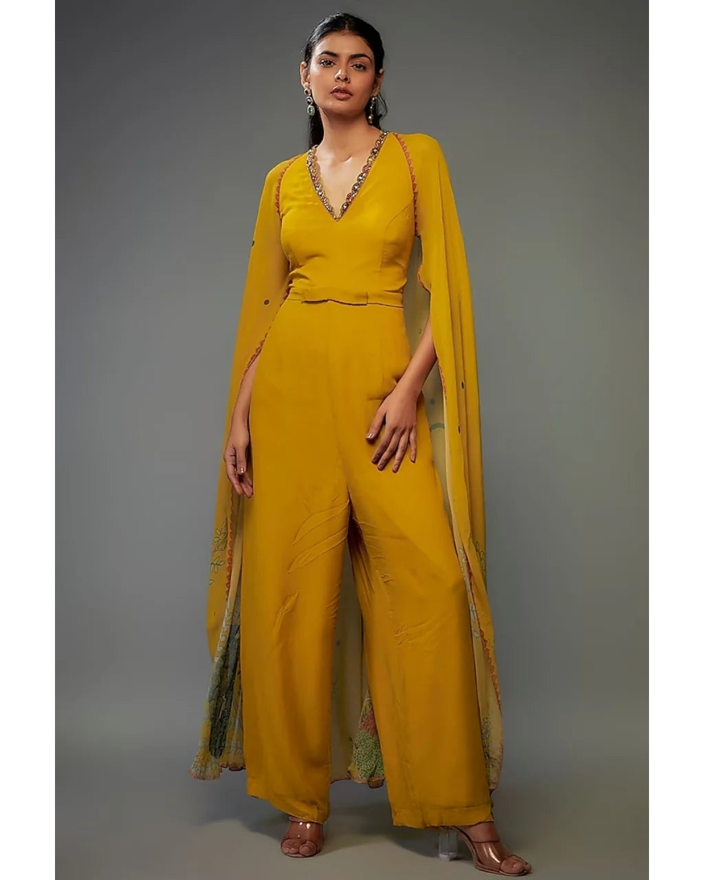 Citrine soirée mustard yellow georgette jumpsuit with handpainted organza cape