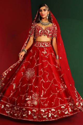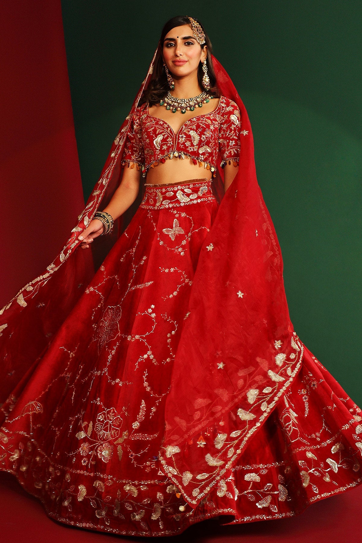 Sindoori red embroidered lehenga in velvet, embroidered blouse and embroidered dupatta with hand made tassels