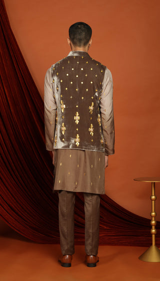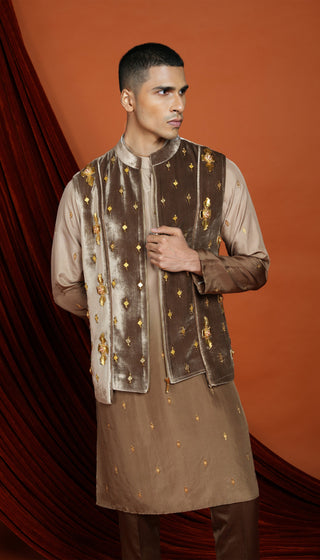 BROWN VELVET BUNDI EMBROIDERED WITH CRYSTALS, GOLD METALLIC ACCENTS, PEARLS, METAL BEADS. PAIRED WITH AN OMBRE HABUTAI SILK KURTA WITH SCATTRED EMBROIDERY OF LIGHT METAL GOLD MATERIAL AND SLEEVES AND BROWN PANTS.