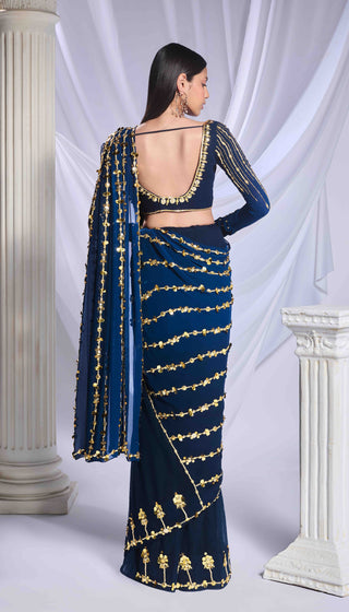 Our midnight blue pre-stitched saree, expertly crafted from a blend of georgette and tulle fabrics, features a delicate floral border adorning the tulle bottom, while the georgette pallu is elegantly embroidered with lines of pearls, metallic details, and acrylics. Paired with this saree is a georgette full-sleeve blouse, featuring metallic motifs and embellished with lines of pearls, golden bricks, and intricate motifs.