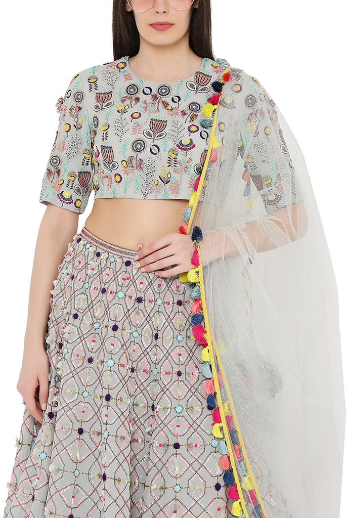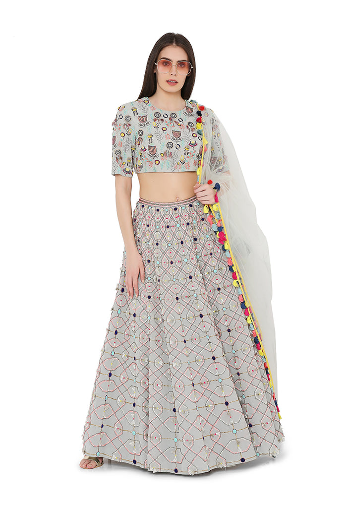Designer Payal Singhal: PALE BLUE COLOUR GEORGETTE BACK TIE-UP CHOLI AND LEHENGA WITH NET DUPATTA PS-FW726-B