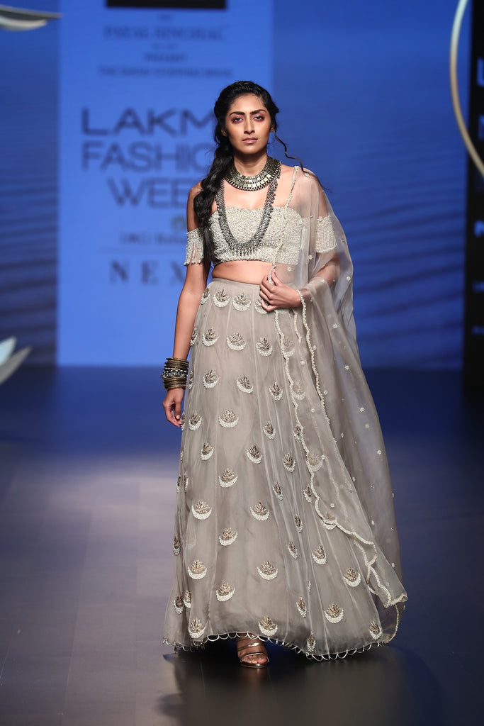 Grey organza pearl embroidered choli with chand embroidered skirt and scallop embroidered dupatta with butis