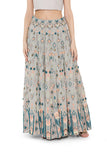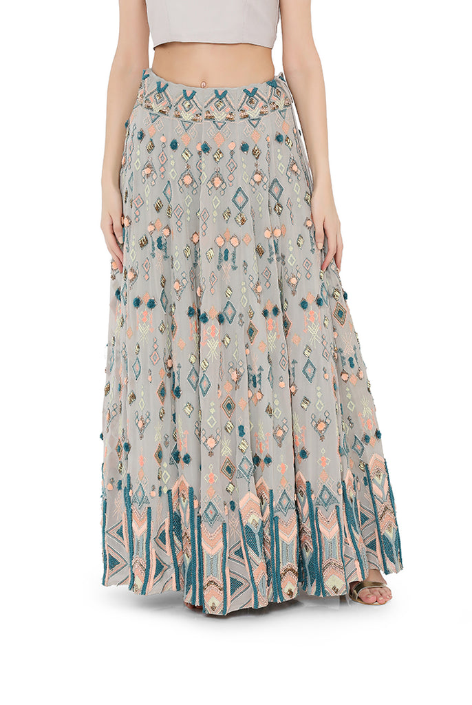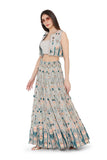 Designer Payal Singhal: Pale blue colour georgette embroidered short jacket with tassel detailing and lehenga with georgette bustier