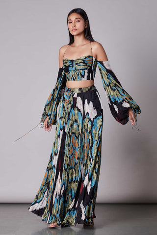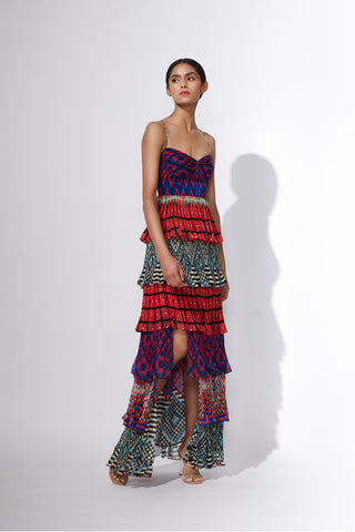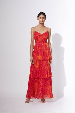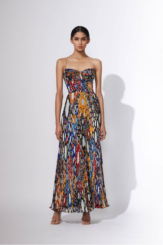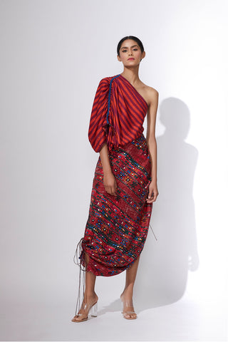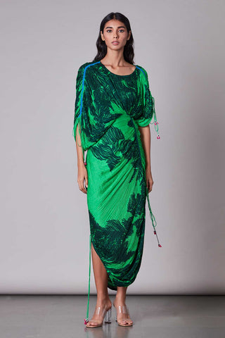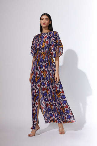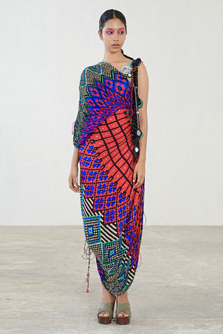 Dual scratch and stripe print hand micro pleated sari dress with adjustable length