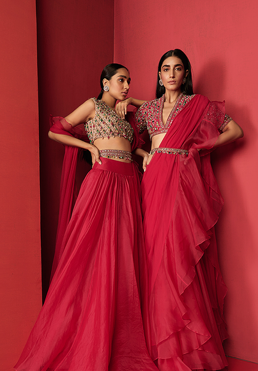 Deep Fuchsia raw silk jeweled embroidered blouse and chiffon-organza draped ruffle saree paired with embroidered belt.