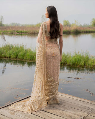 • LIGHT GOLD, PRINTED CHROME APPLIQUE SAREE ADORNED WITH CRYSTALS AND SEQUINS; PAIRED WITH A BRALETTE-STYLE BLOUSE WITH TASSEL DETAILS.