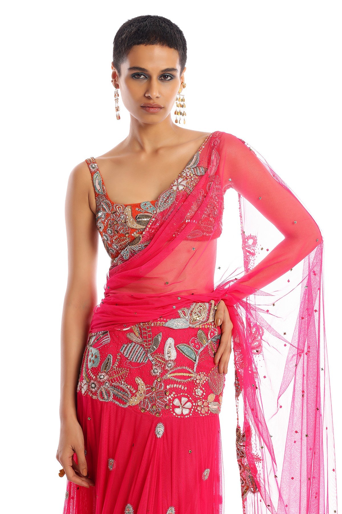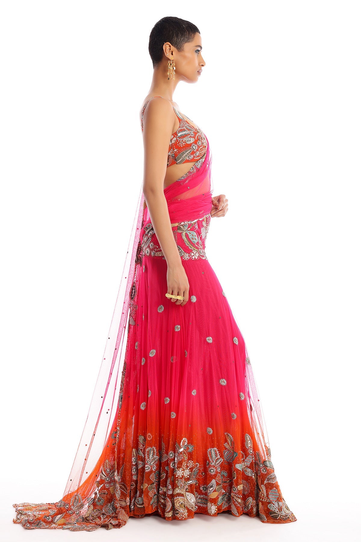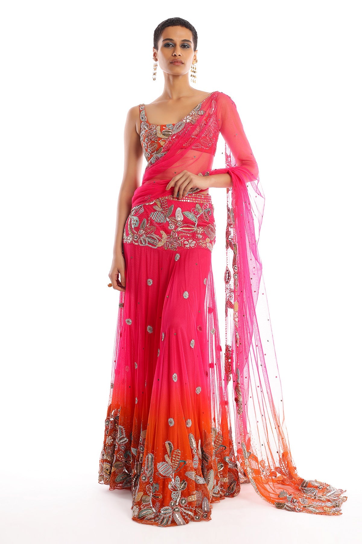 Kinfolk fushia-tangerine ombre applique embellished tulle lehenga saree with tangerine blouse.