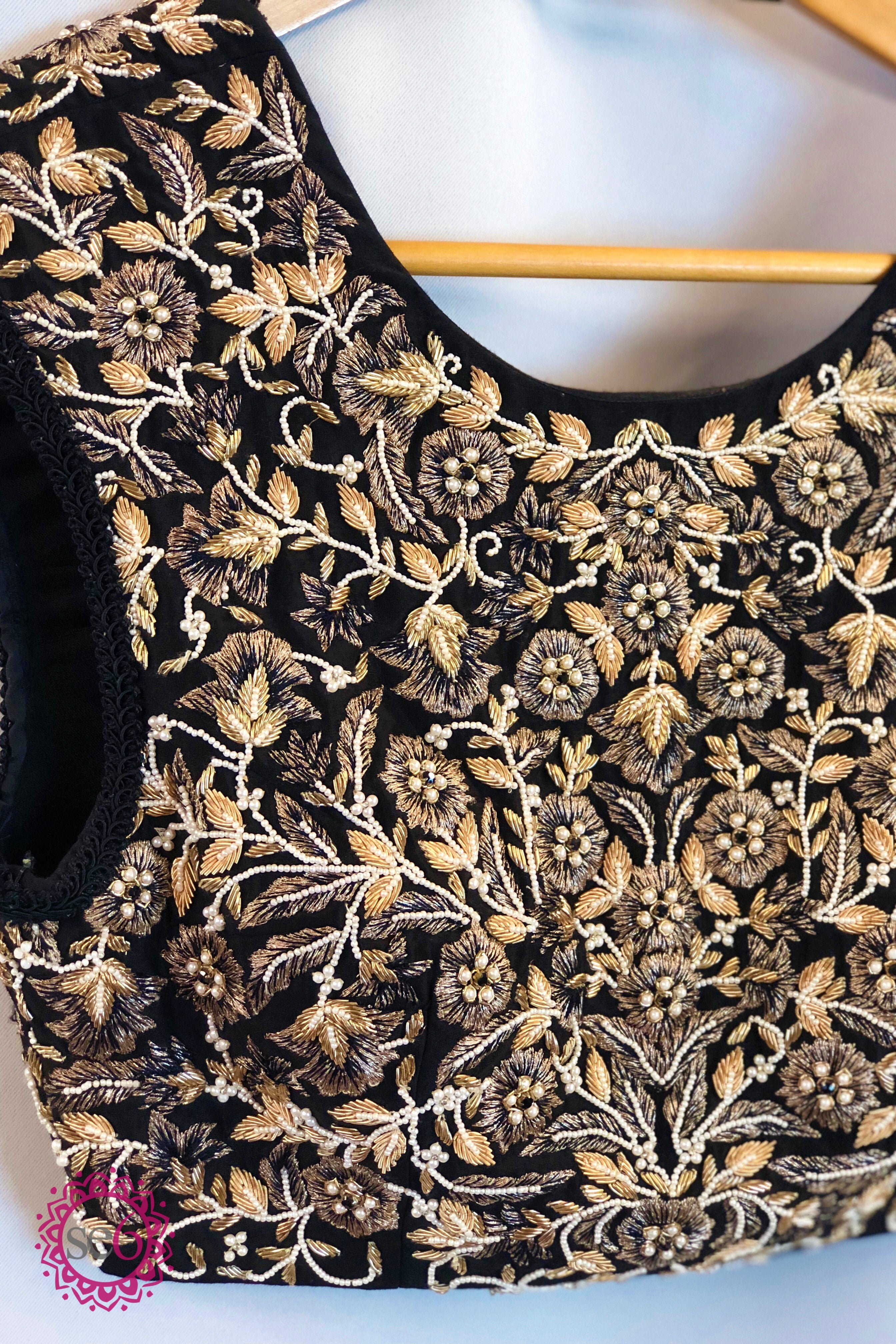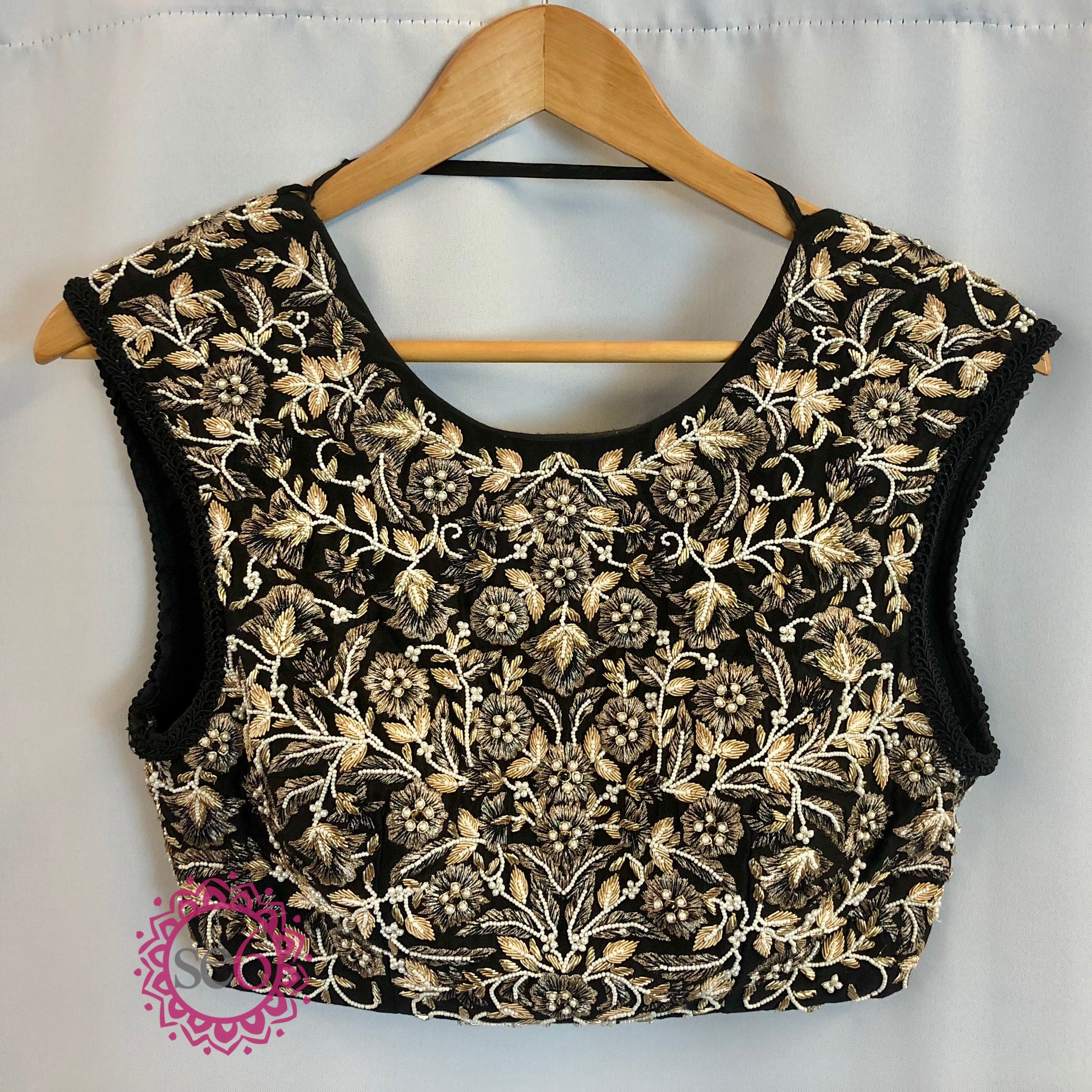White Gold Floral Embroidered Black Blouse- Ready to Ship
