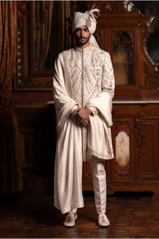 Ivory, collared Sherwani with intricate architectural motifs, encrusted with silver and emerald stones and adorned with beads, sequins and crystals. It is styled with a pair of raw silk pants, a bordered Dupatta and a Safa with feathered Kalgi