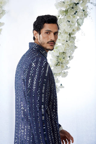 This midnight sherwani set features all over mirror work on a raw silk base. It is paired with an off-white cotton kurta and a afghani cotton silk salwar. Completing footwear is also available.