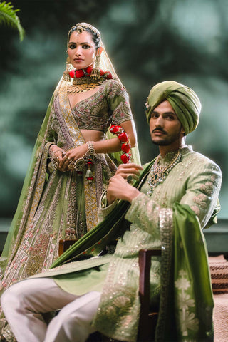 Description:A beautiful sage hue makes The Pista Barfi Sherwani perfect for daytime celebrations. With contrast trousers and kurta and a heavily embellished Sherwani intricately embroidered with zardozi and dabka. Hosting a medley of signature motifs- this sherwani is as soothing as the sweetdish it's named after.