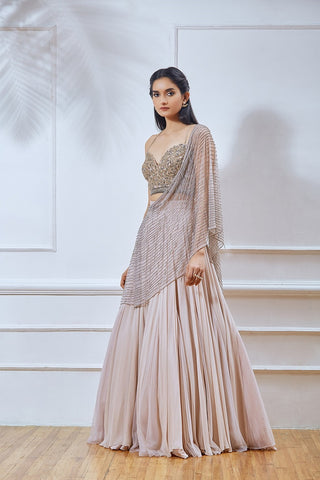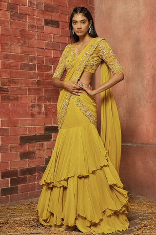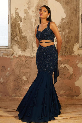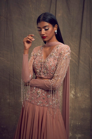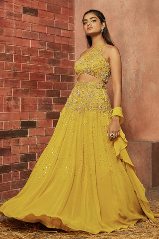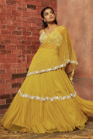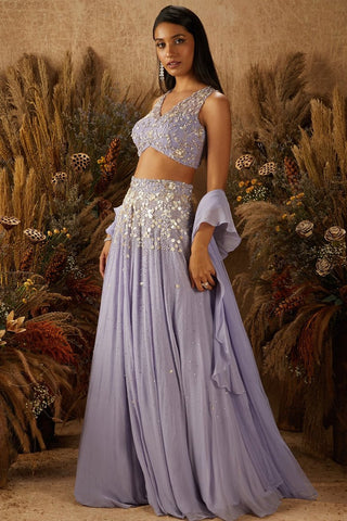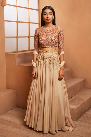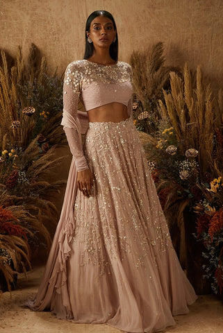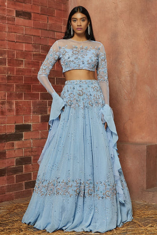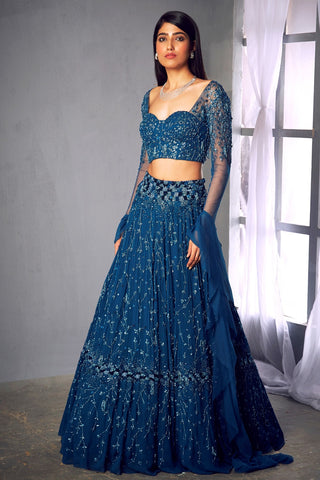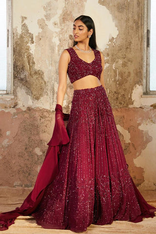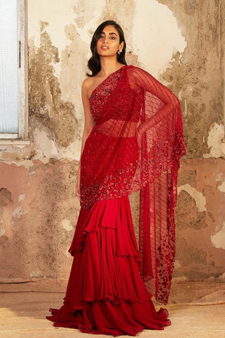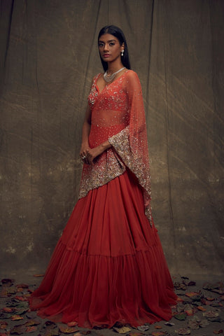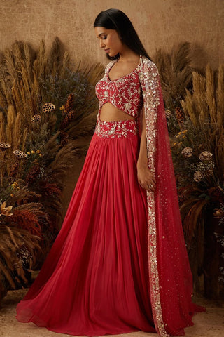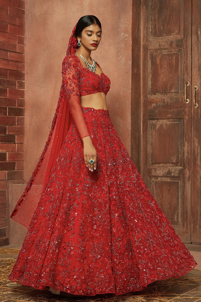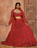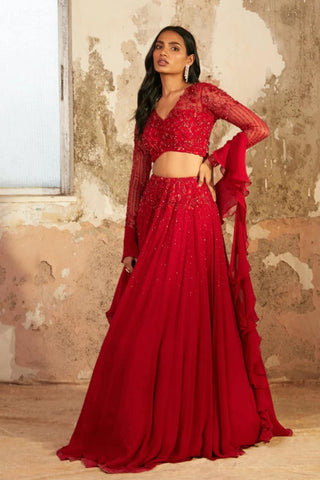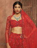 Red organza heavy hand embellished lehenga paired with a full sleeve embellished blouse and concept back & a net embellished dupatta to match
