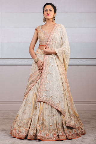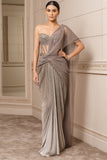 A Concept Saree In A Crinkle Tulle Fabric That Features A Draped Waistline And Is Paired With A Contemporary Corset Embroidered In Sequins All Over