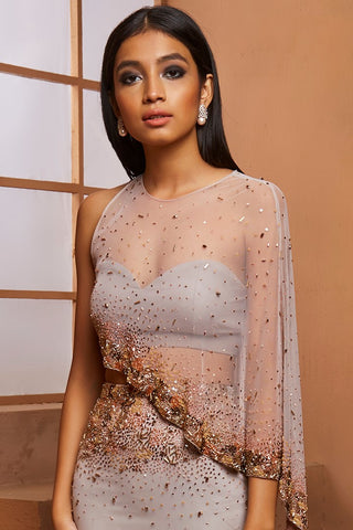 Grey fitted mermaid style gown with gold rose gold embellishment and embellished cape.