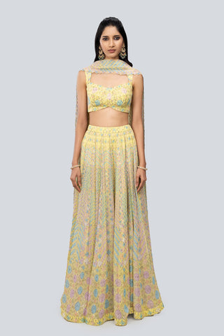 Aurelia - yellow paper dolls raw silk appliquéd and embellished lehenga with blouse and cutwork dupatta