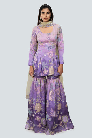 Carnation - plum pastiche organza printed and embellished top and skirt with scallop dupatta