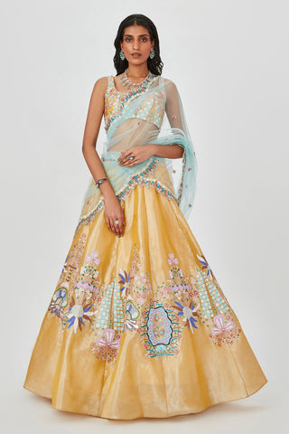 Dia - yellow nadenka raw silk appliquéd and embellished lehenga with blouse and cutwork tulle dupatta