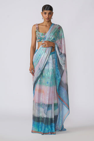 Evangeline - sky blue tissue appliquéd and embellished lehenga with blouse and dupatta
