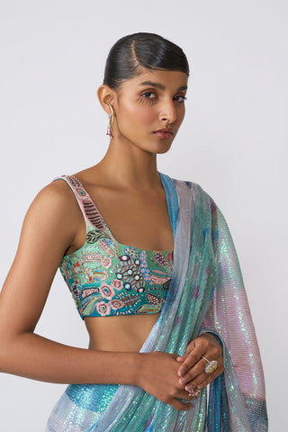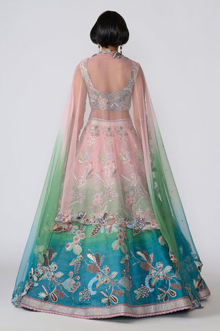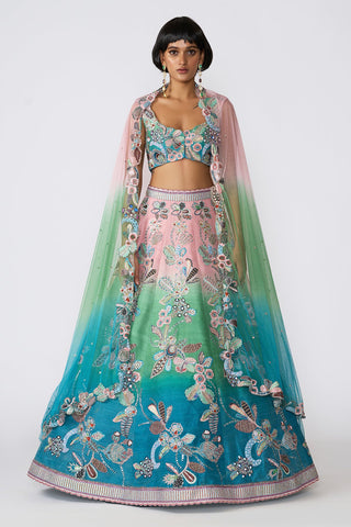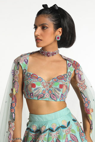 Payal - turquoise juna tissue appliquéd and embellished lehenga with blouse and cutwork tissue dupatta