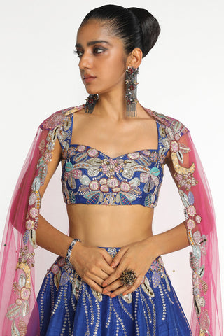 Bluebonnet - electric blue pastiche raw silk appliquéd and embellished lehenga with blouse and cutwork tulle dupatta