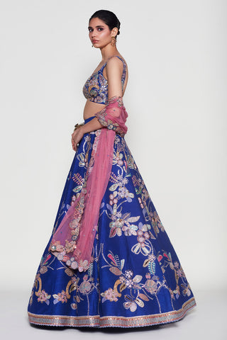 Meenal - electric blue juna raw silk appliquéd and embellished lehenga with blouse and cutwork tulle dupatta