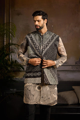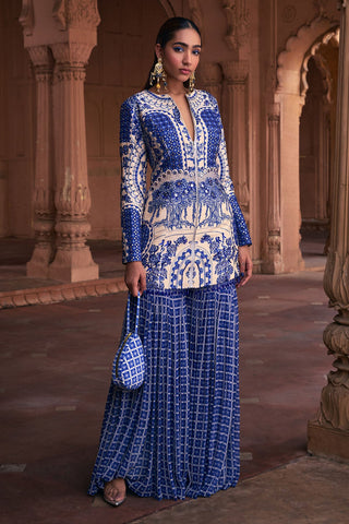 Multi-color print and highlighted plunge neckline blouse with sharara saree set