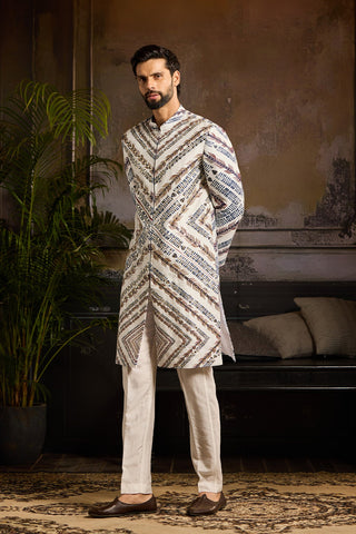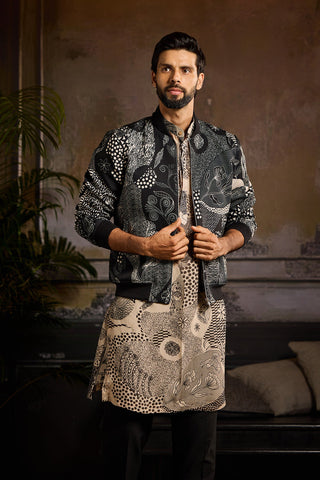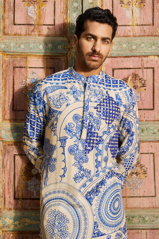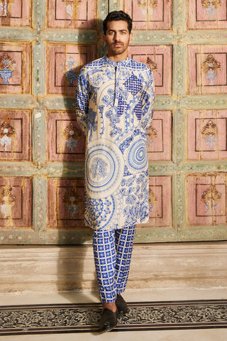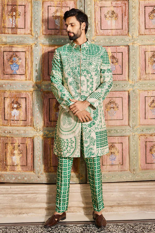 Ivory butta print and highlighted blouse with teal print and highlighted gharara saree set