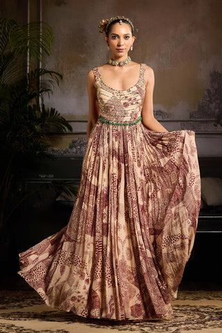 Caramel print and highlighted plunge neck blouse with sharara saree set
