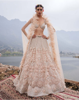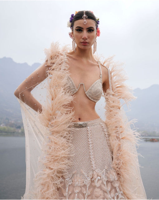 - LIGHT PEACH LEHENGA WITH SIGNIFICANT PEACH AND IVORY FLORAL MOTIFS ADORNED WITH SEQUINS, CRYSTALS AND BEADS. THE LEHENGA IS STYLED WITH A BRALETTE-STYLE BLOUSE AND A TULLE DUPATTA WITH FEATHERS ON THE BORDER