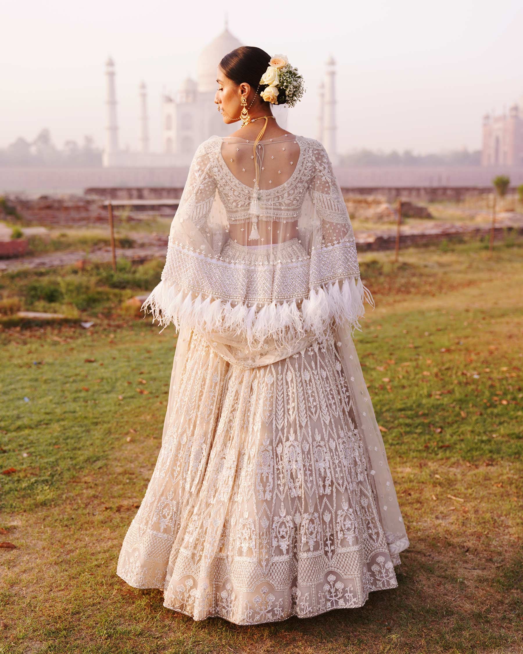 • LIGHT BEIGE-BASED, IVORY LEHENGA WITH INTRICATE IVORY THREADWORK FOLIAGE MOTIFS AND ADORNED WITH SEQUINS, CRYSTALS AND BEADS. THE LEHENGA IS STYLED WITH A FULL-SLEEVES BLOUSE WITH TASSEL DETAILS AND A TULLE DUPATTA WITH FEATHERED-BORDER. Note Cape pictured is an additional $1195