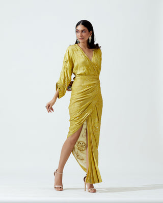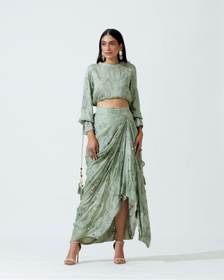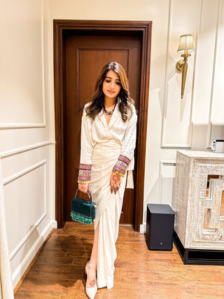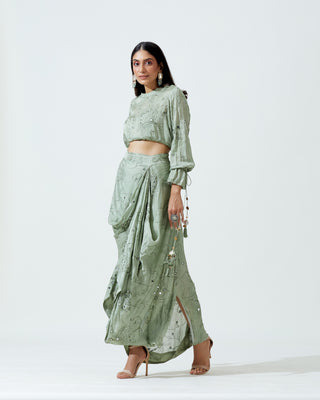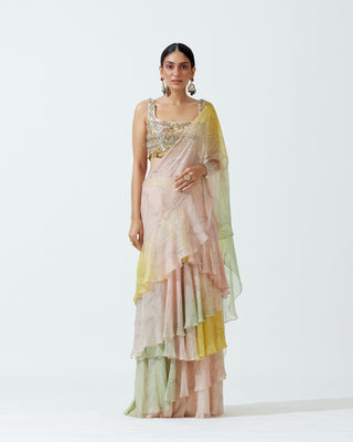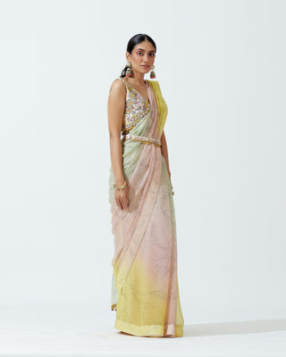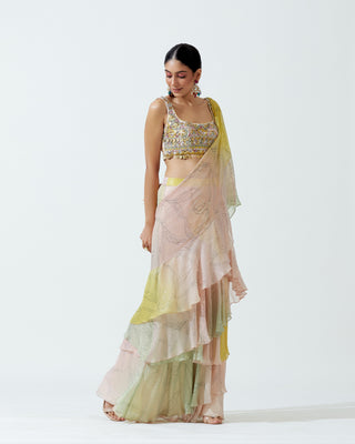 A pre-stitched modern sari ensemble (two-piece).