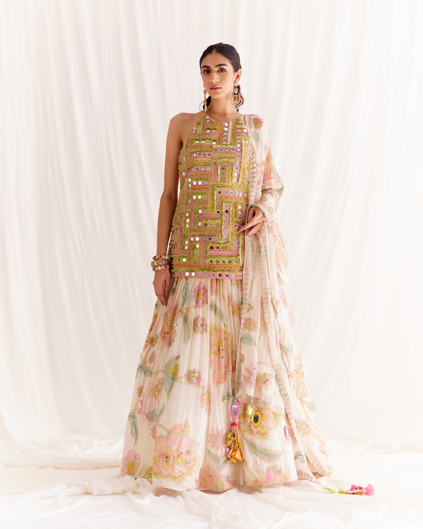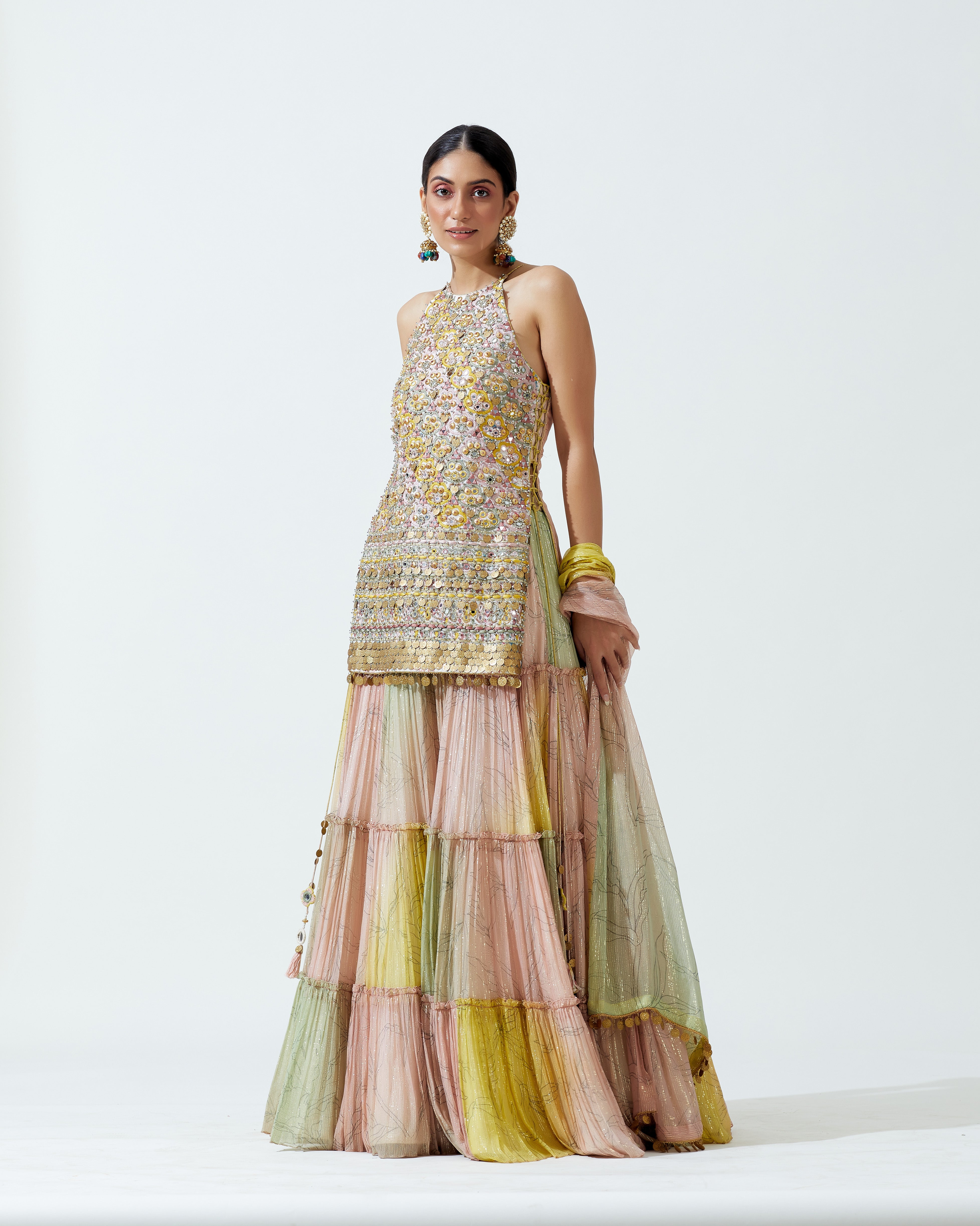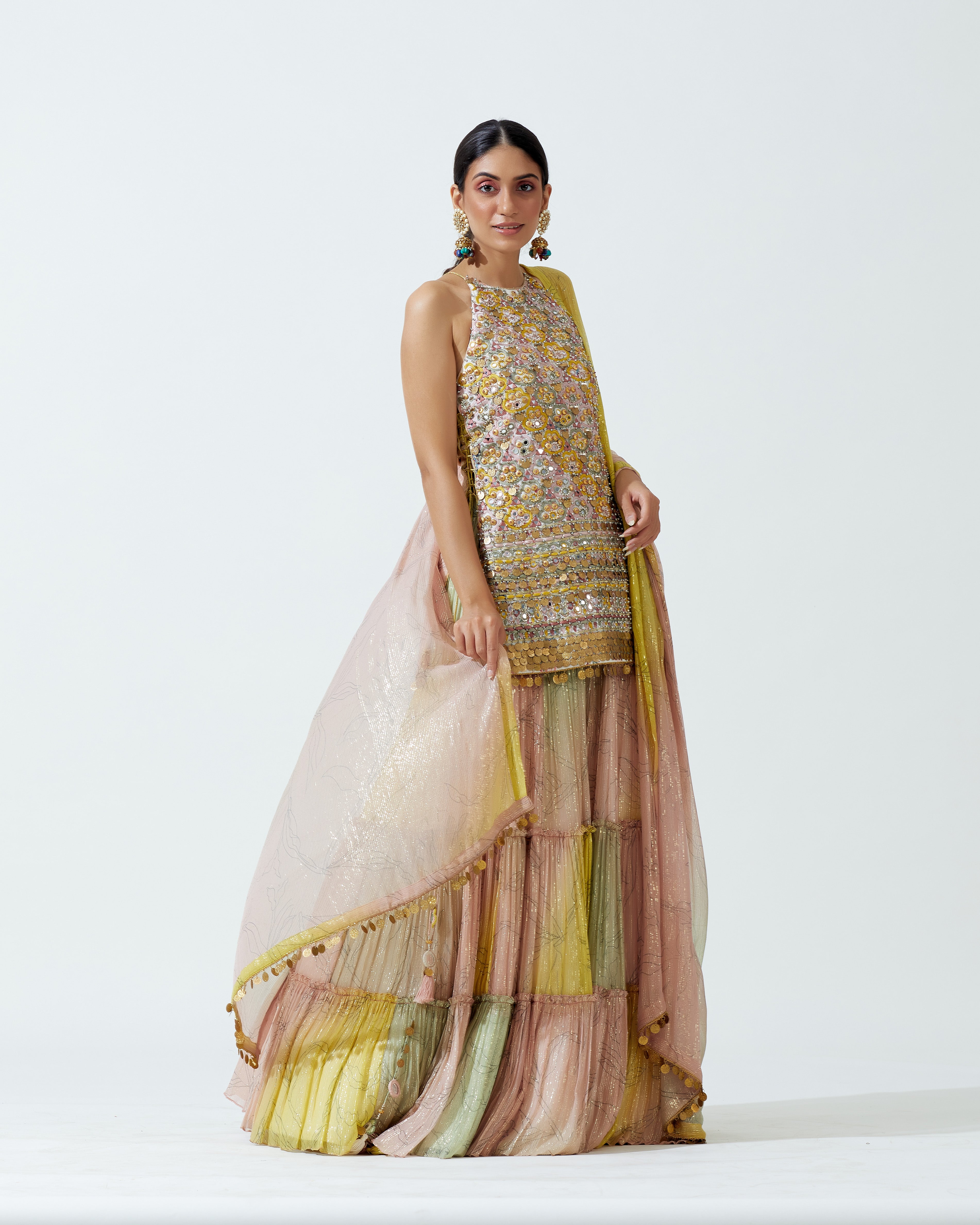 Asymmetrical gilet and bandeau and patola flared palazzos.