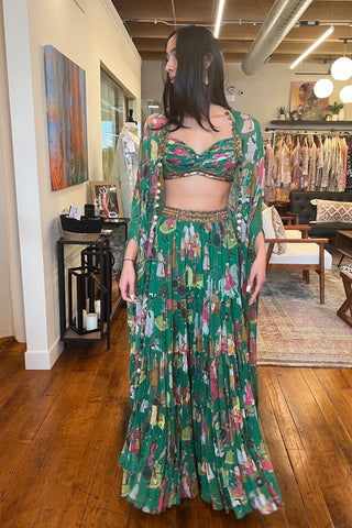 Featuring a printed green georgette top, cape and skirt set with hand detail embroidery. It is paired with a cape