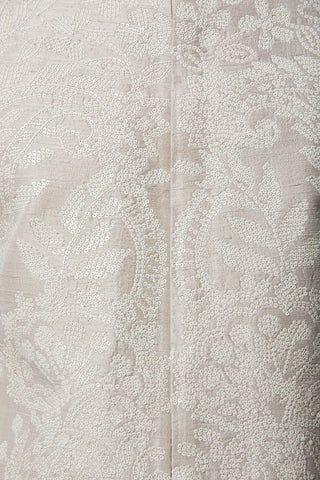 This sherwani set features all over matt sequin on a sand raw silk base. It is paired with off-white silk kurta and soften raw silk afghani salwar. Complimenting stole and footwear is also available.