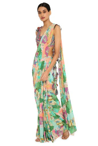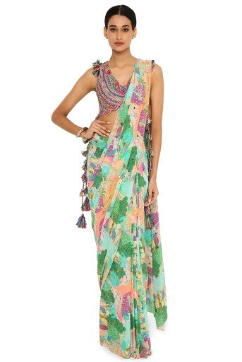 Akhira grey colour embroidered choli with peach kuno print georgette pre-stitched saree