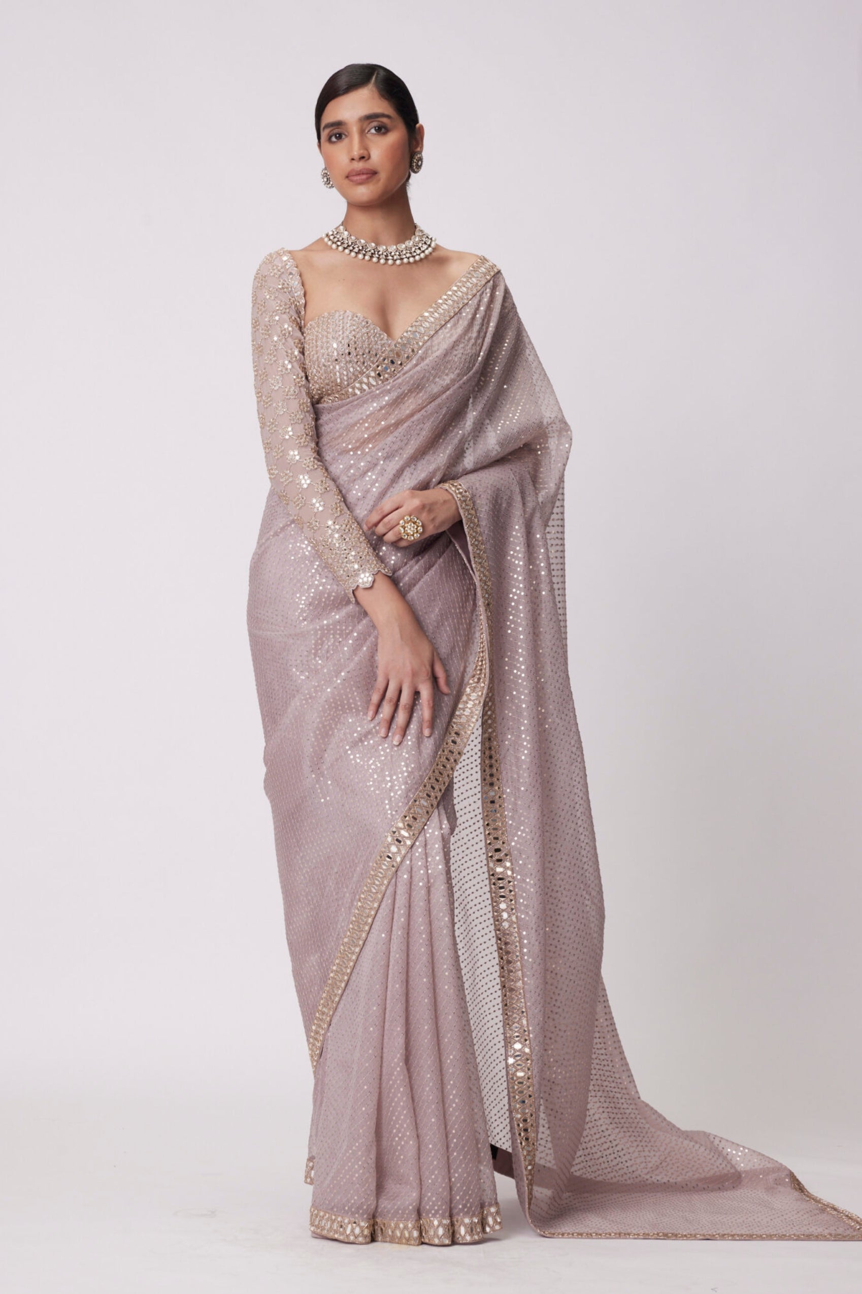Ash Pink Organza Saree Clubbed with Real Hand Cut Mirror Embroidered Full Sleeve Blouse.