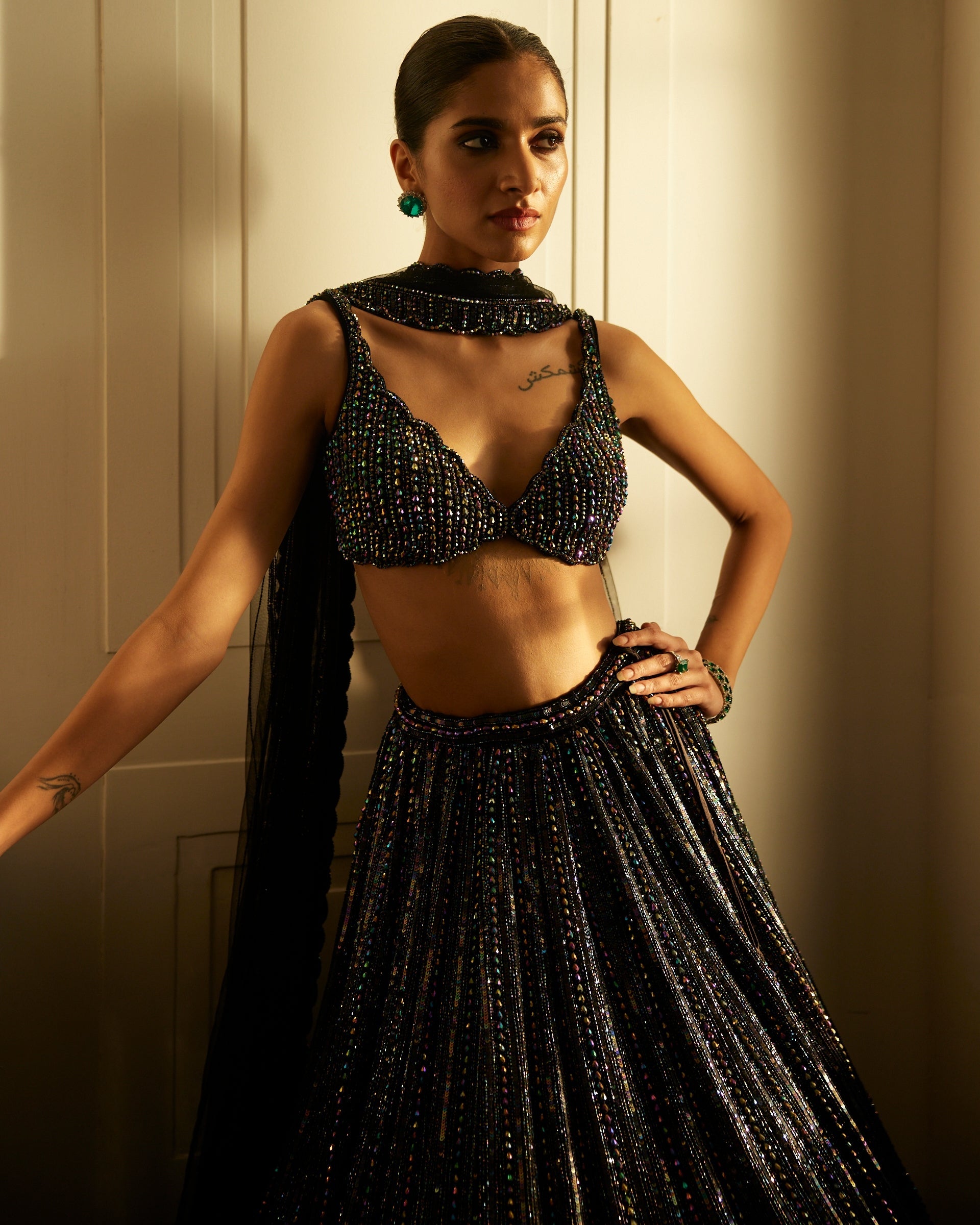 Elevate your style with our black crystal linear embroidered lehenga set. Hand embroidered with intricate sequins, cutdana, and crystal embellishments, this stunning lehenga and dupatta set is perfect for any special occasion. The jeweled blouse adds a touch of glamour to complete the look. Unleash your inner fashion icon with this exquisite piece.