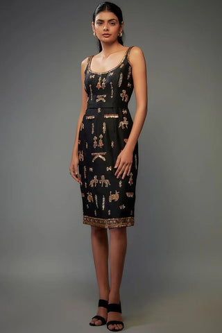 Expertly crafted for a sleek and tailored fit, our black embroidered bodycon dress is a must-have for any wardrobe. Featuring intricate hand embroidery detailing, this dress adds a touch of elegance and sophistication to your look. Made with premium materials, it offers a comfortable and stylish silhouette. Perfect for any occasion.