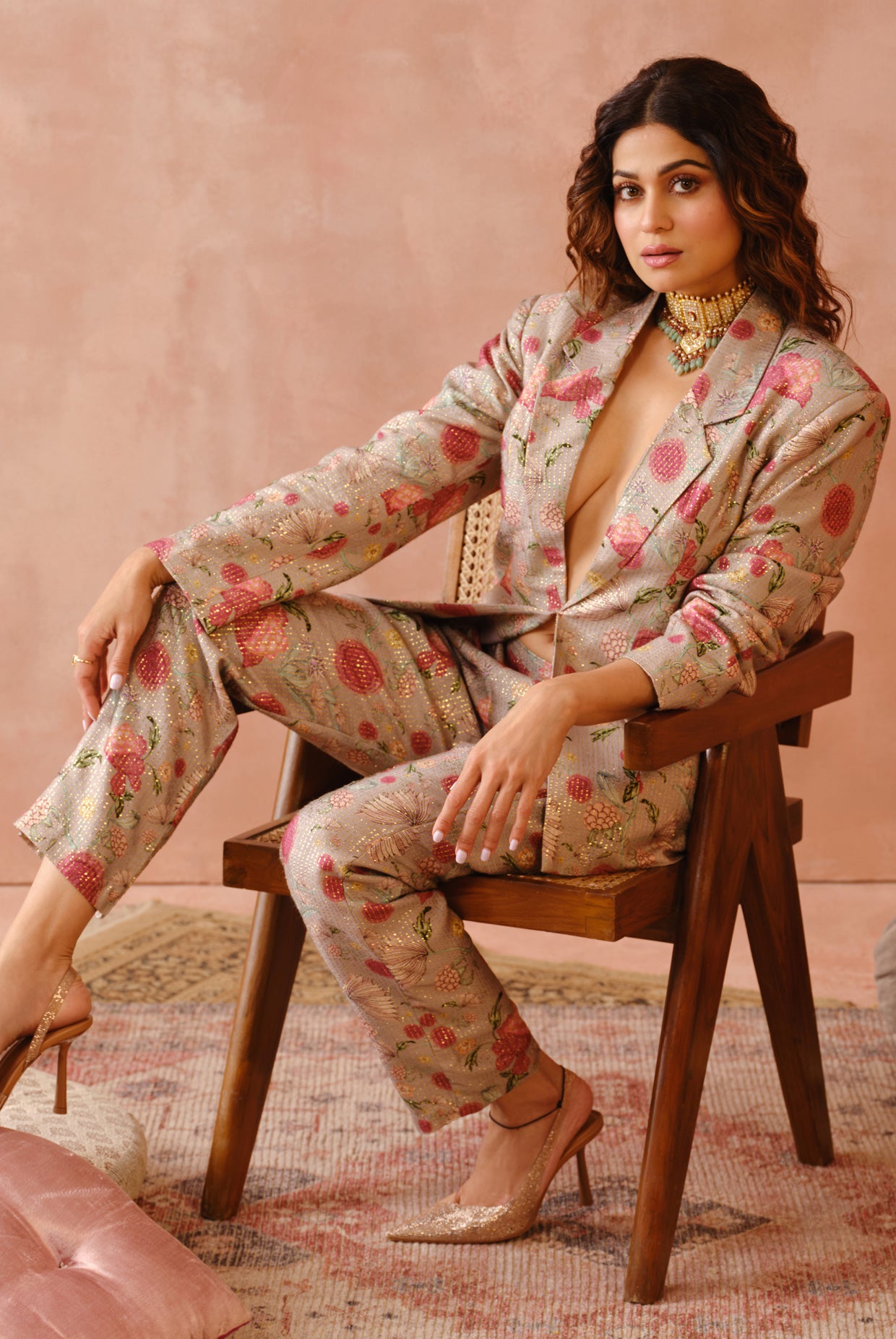 Shamita shetty in grey gulbagh print blazer with bustier and pant