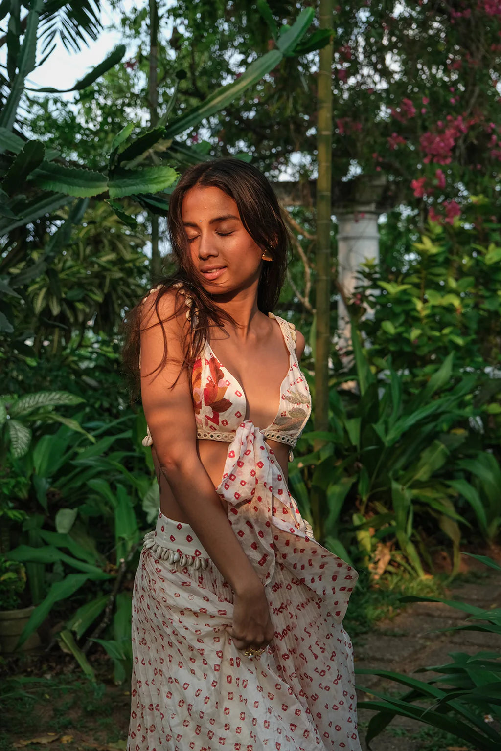 Skirt - Vintage pleated, high - waisted handwoven, hand - dyed white calf length silk bandhini skirt with seashells.