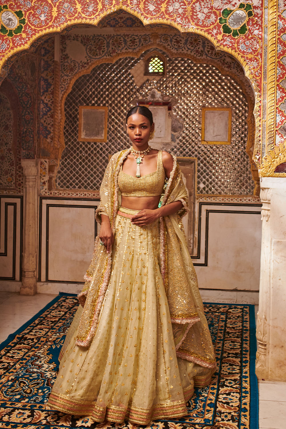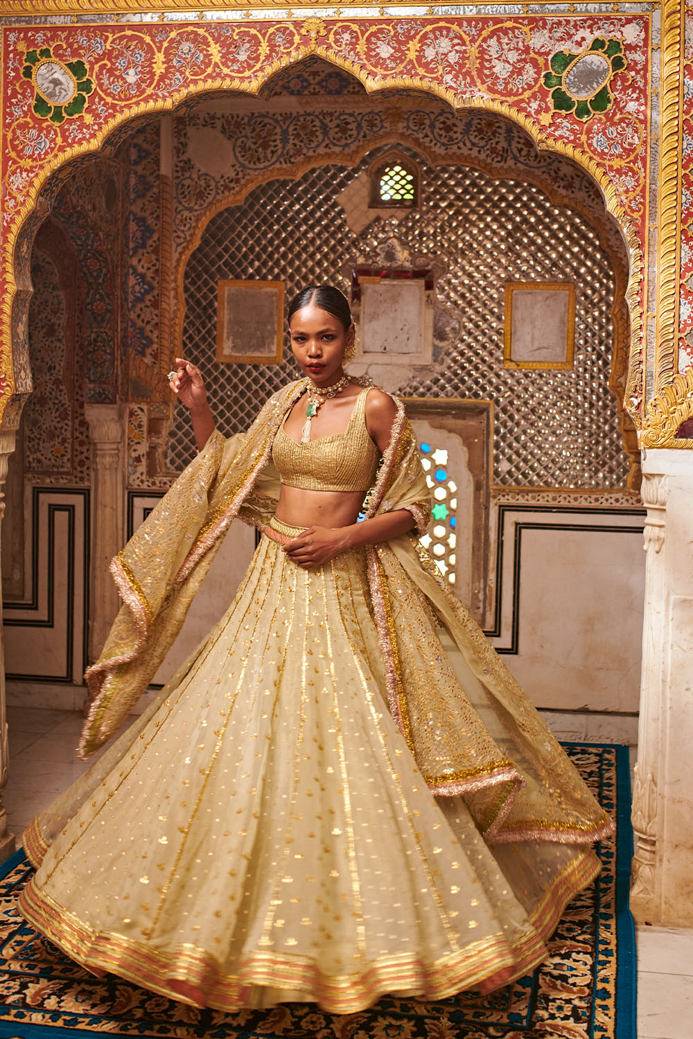 Mint green lehenga embroidered with gota patti edge with lampi stripes. Mint green organza dupatta embroidered with gota patti fine with kiran & Gold metallic blouse