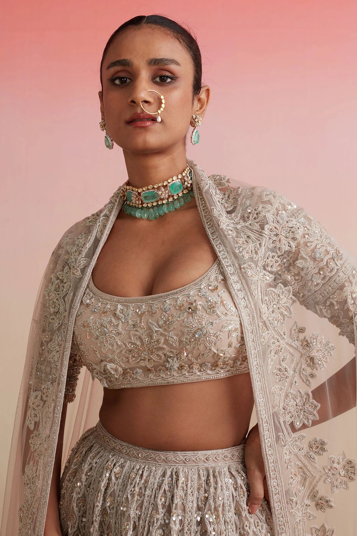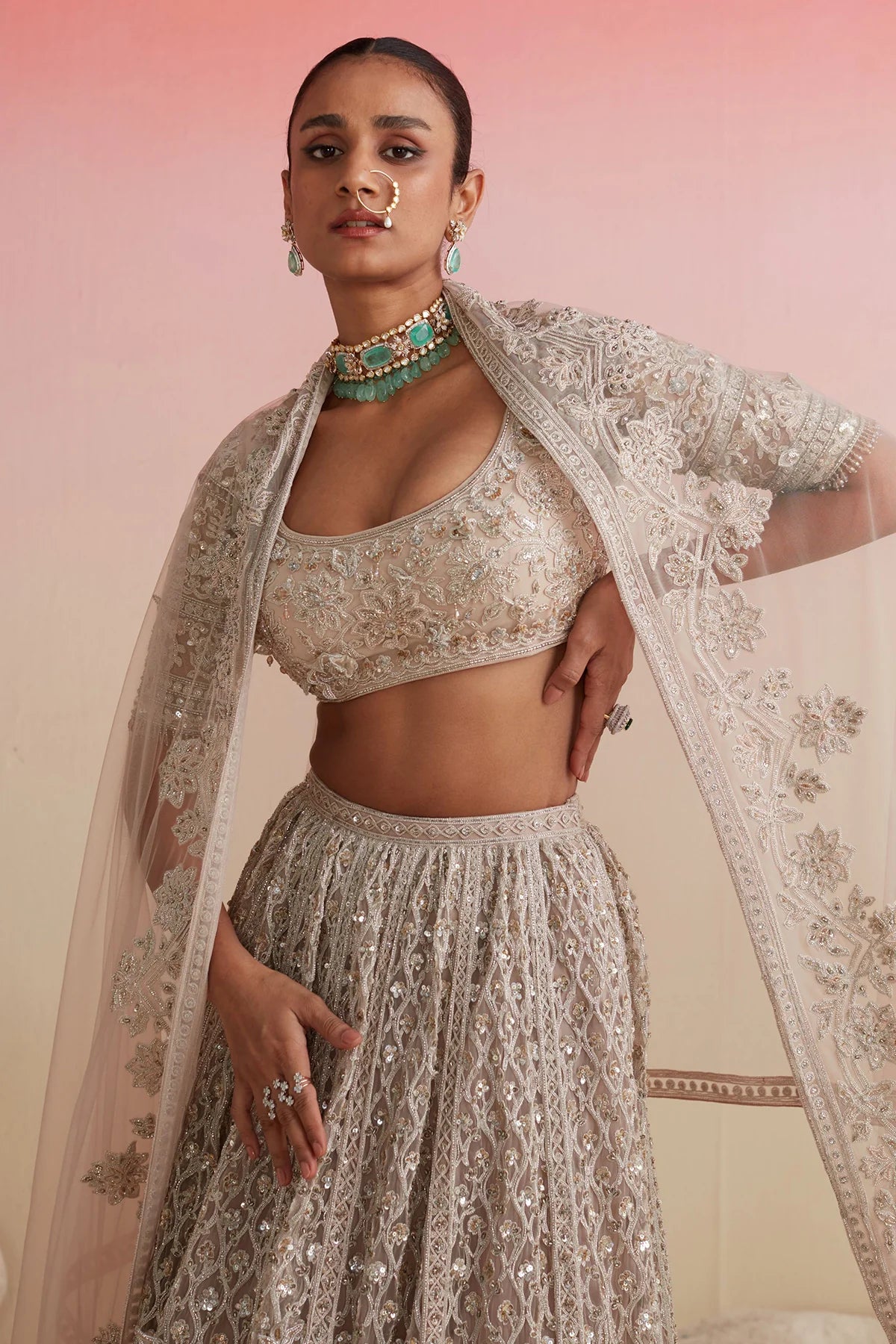 Champagne Gold Fully Embroidered Net Blouse paired with heavily embroidered net Lehenga with net frills and net dupatta