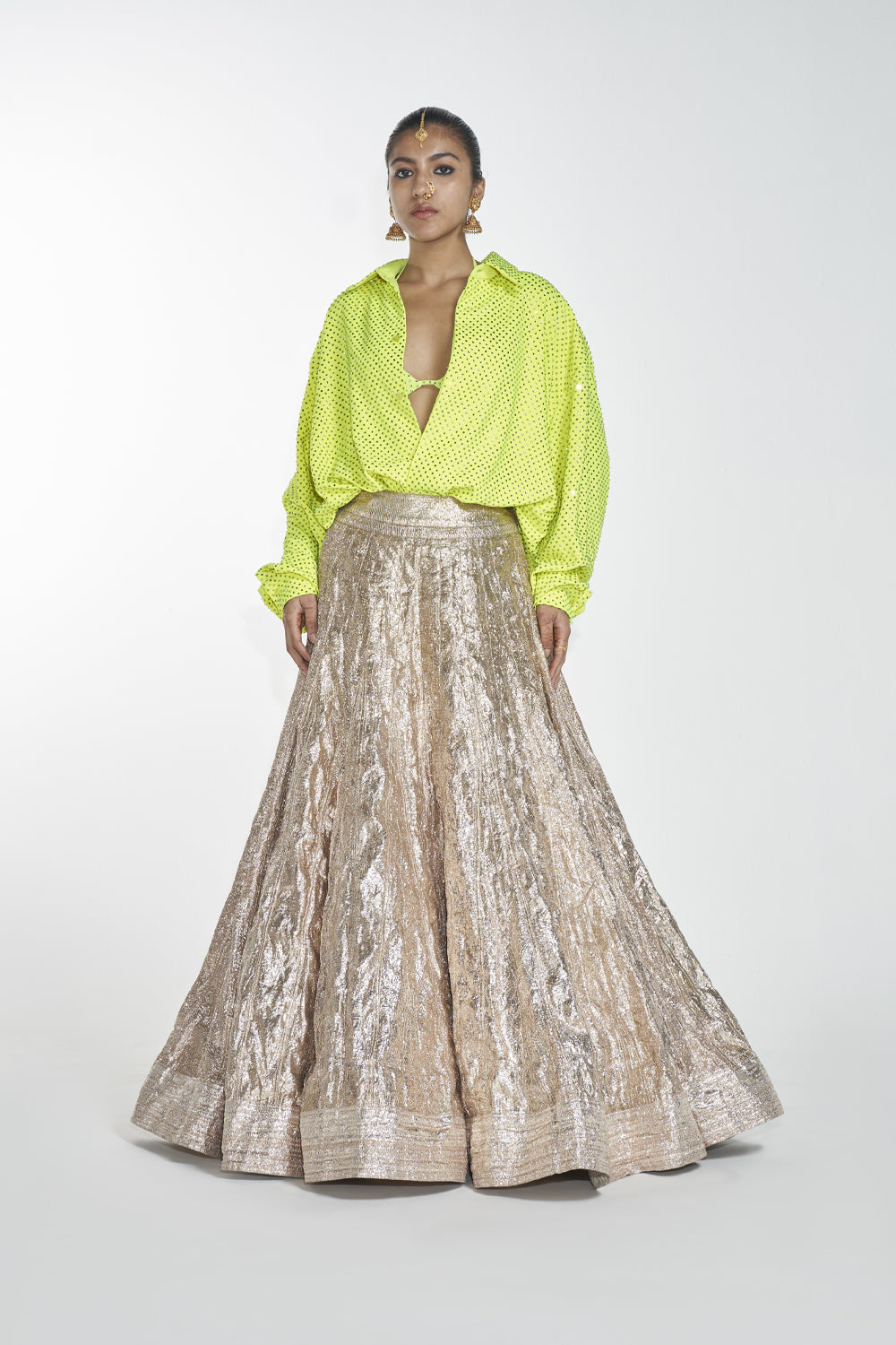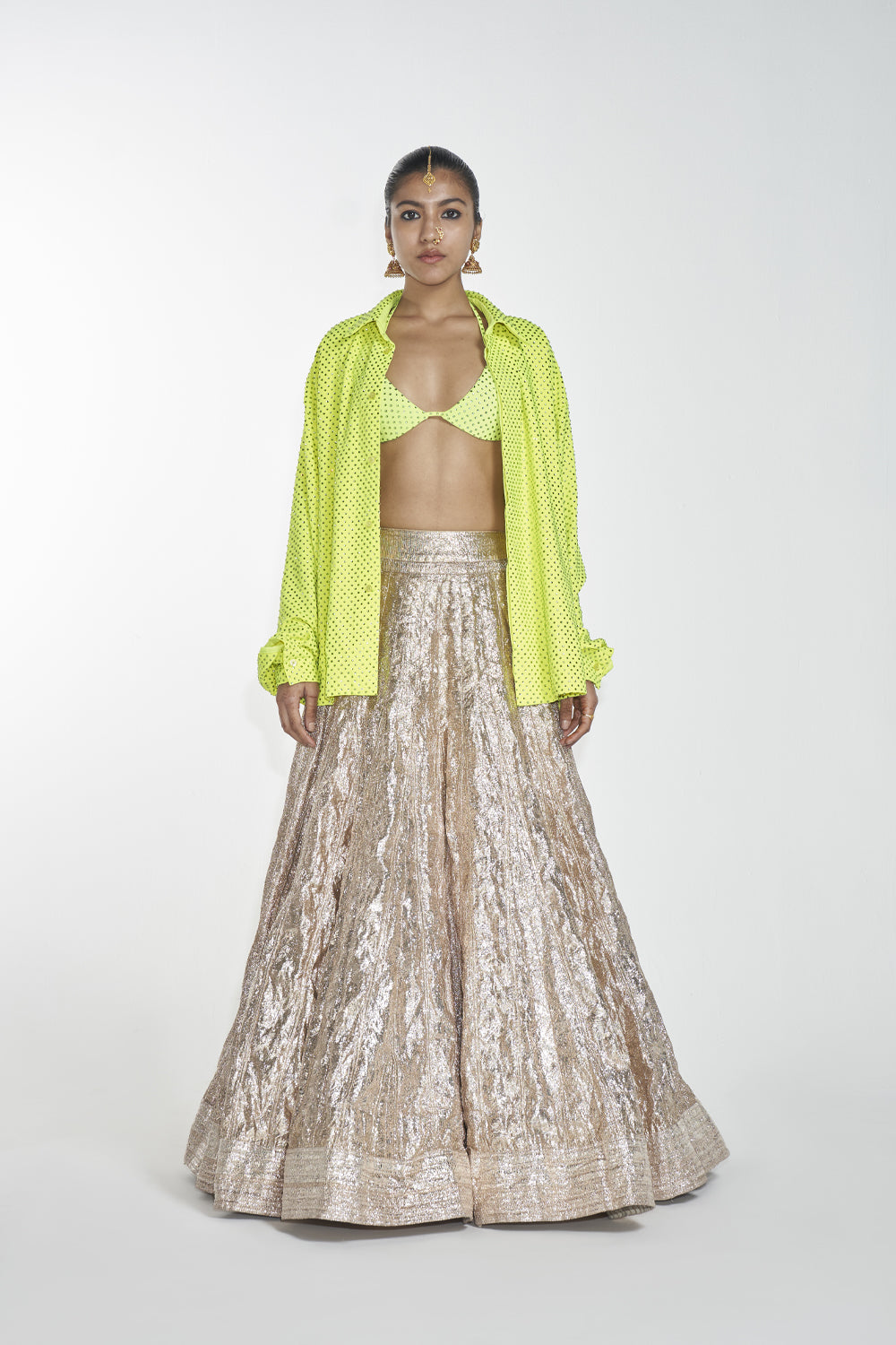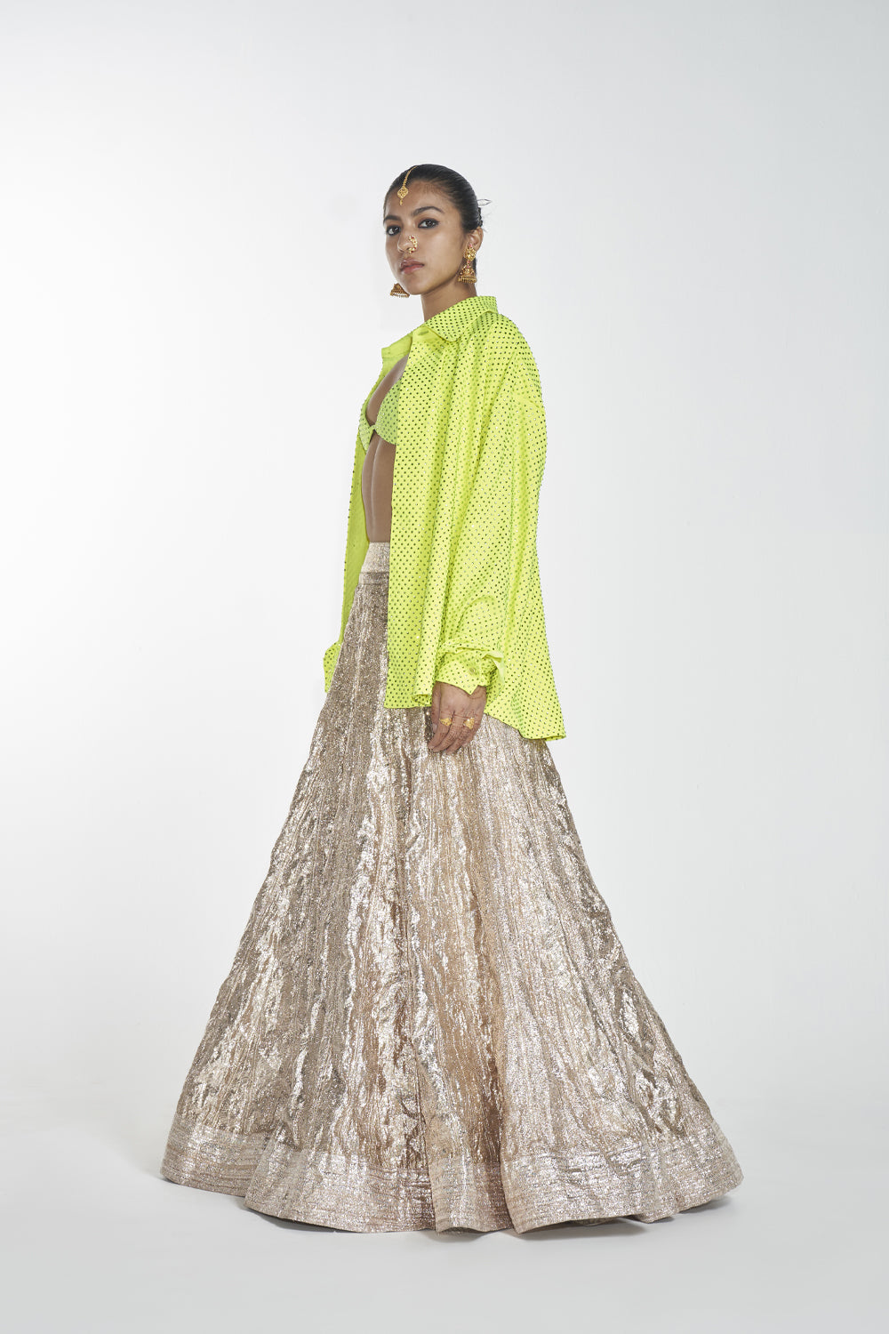Peridot Crepe Crystal Shirt and bralette with Gold lampi Lehenga