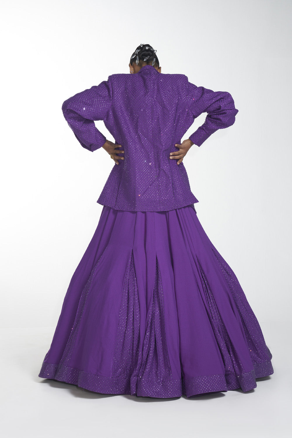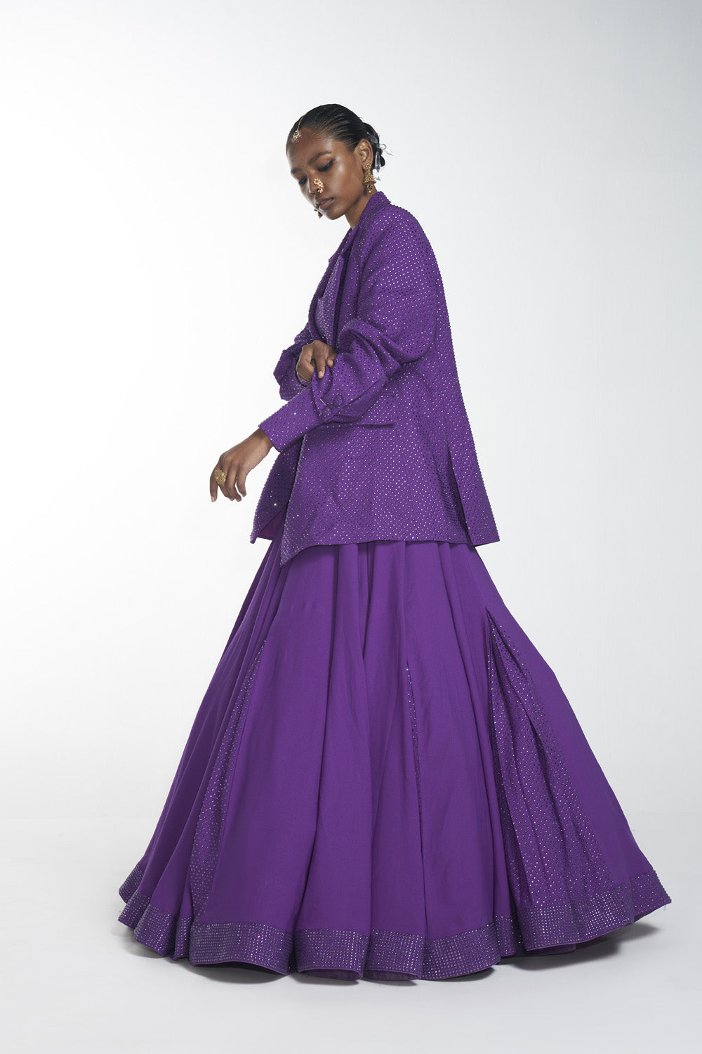 Tanzanite Lehenga & Square neckline sleeveless Blouse With Blazer. All in Crystal embellished crepe fabric.