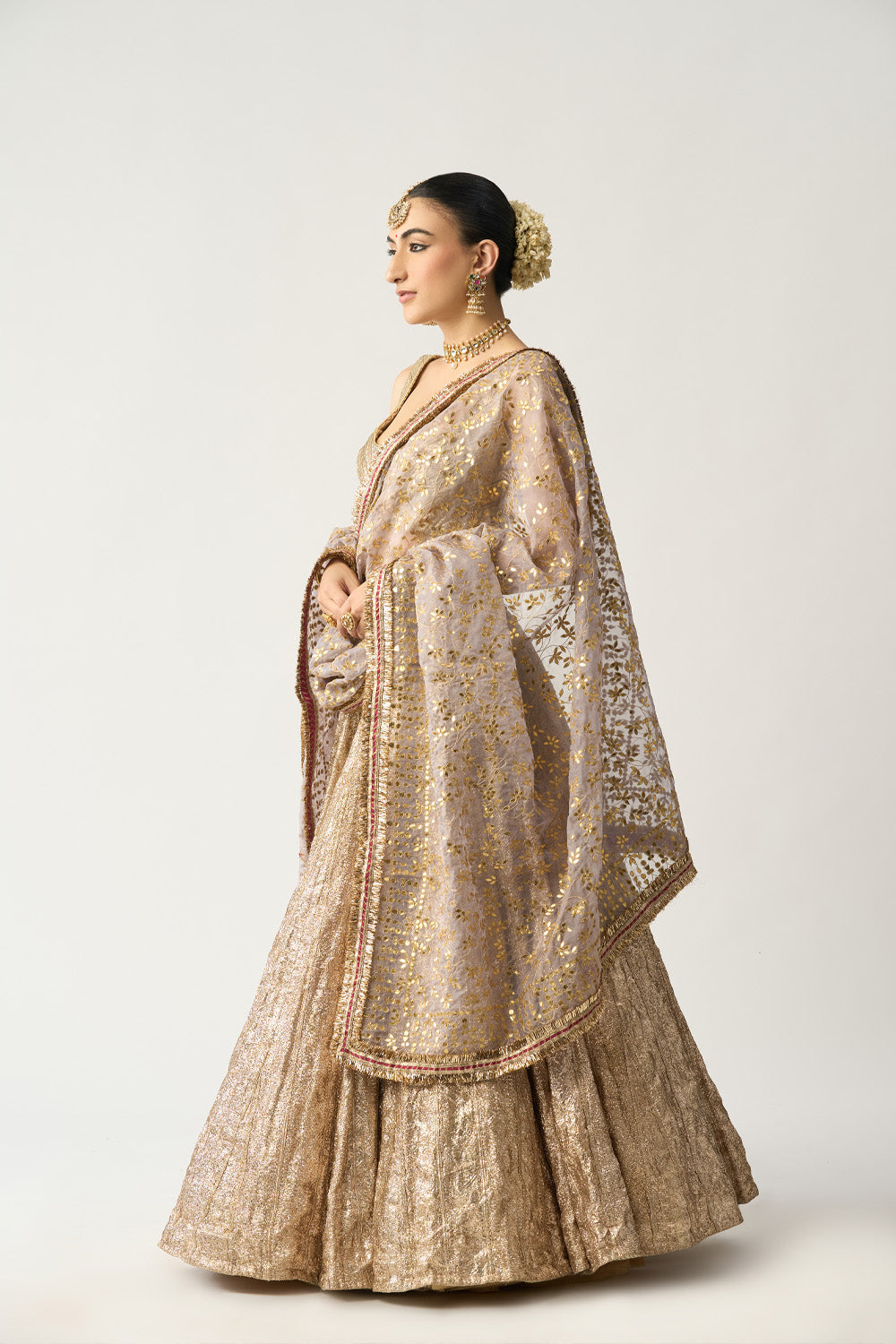 Product Info:- Silver Lampi Lehenga and Blouse + Lilac Silk Organza Gota Patti Dupatta Edged With Kiran