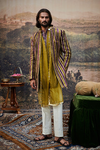 Olive and purple velvet jacket with gotta stripes with purple chanderi kurta and white pants and stole.