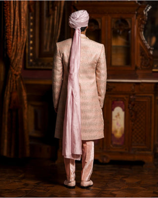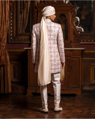 Off-white and pink, collared Sherwani with intricate floral motifs, adorned with beads and crystals. It is styled with a pair of raw silk pants and a Safa