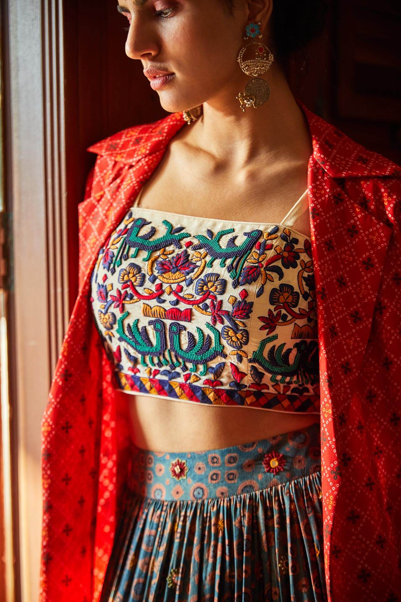 Label Anushree : Ajrakh print mirror work lehenga & a classic handwork busiter teamed with a bandhani print jacket