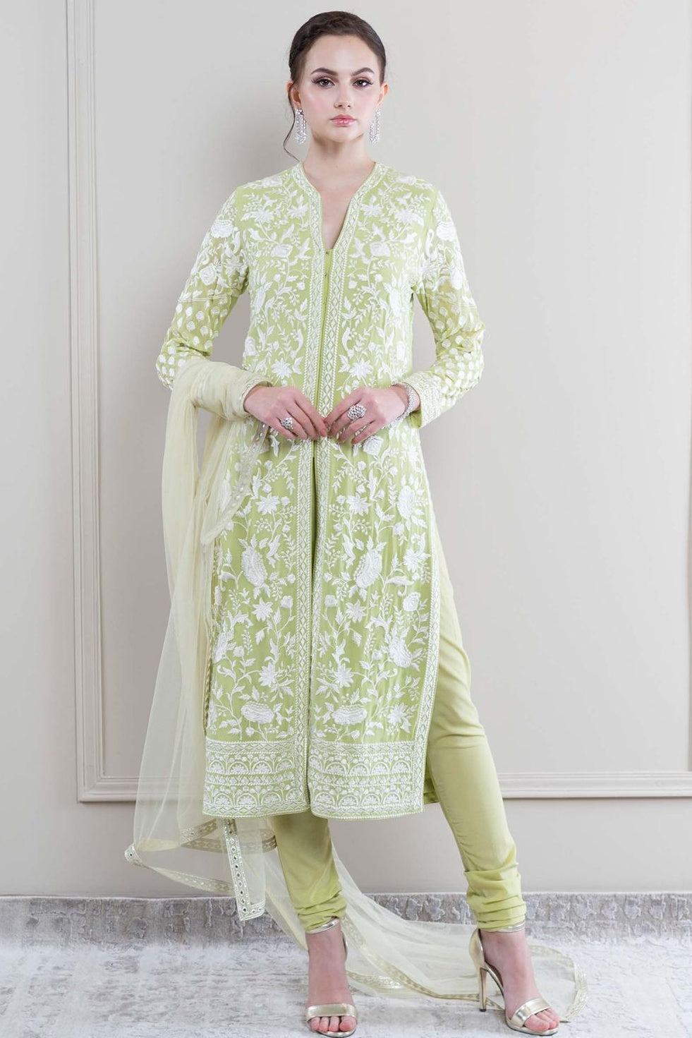 • Leafy green chrome applique kurti with, churidar & dupatta